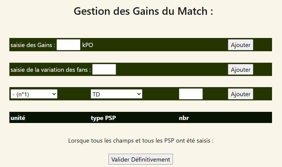 Au moment où le bouton « Valider Définitivement » est cliqué, les gains sont automatiquement rajoutés dans l'équipe. Il sera alors possible de la faire évoluer (achat de compétence avec les PSP, achat de nouveaux joueurs ou du staff avec les PO, etc).